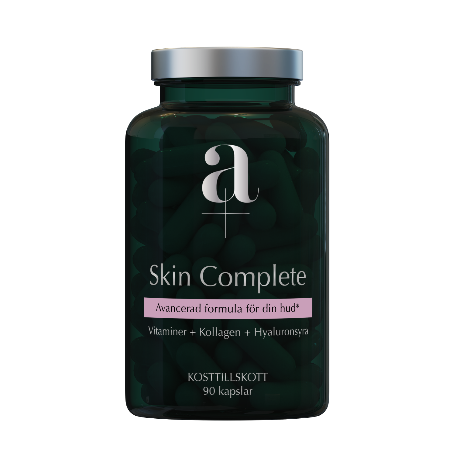 Med åldern leder förändringar i metaboliska processer av strukturella komponenter i huden till synliga tecken på åldrande, såsom ökad torrhet och rynkor. A+ Skin Complete innehåller hydrolyserat typ I kollagen från fisk. Typ I är den vanligaste formen av kollagen i kroppen och den som framför allt finns i stora mängder i hud, hår och naglar.