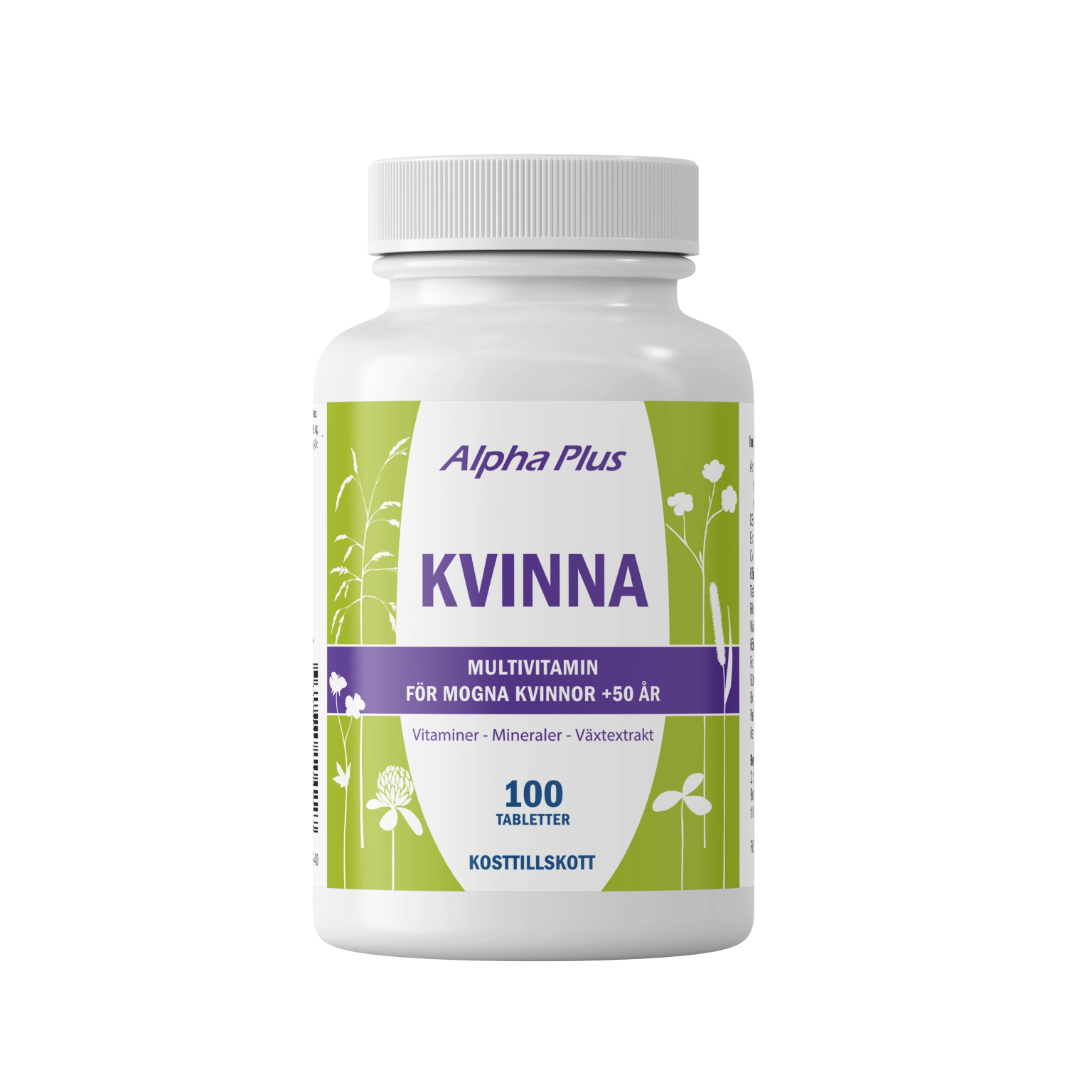 Alpha Plus Kvinna innehåller utvalda vitaminer och mineraler för mogna kvinnor som passerat den fertila åldern. D-vitamin och kalcium bidrar till att bibehålla normal benstomme. C-vitamin bidrar till att minska trötthet och utmattning. Innehåller en unik patenterad version av vitamin K2, menakinon-7, den typ av vitamin K2 som utvinns ur japanska livsmedlet natto. OBS! Hösten 2023 justerades formuleringen av denna produkt. Ändringarna i detalj kan du ta del av under fliken ”Övrig information”.
