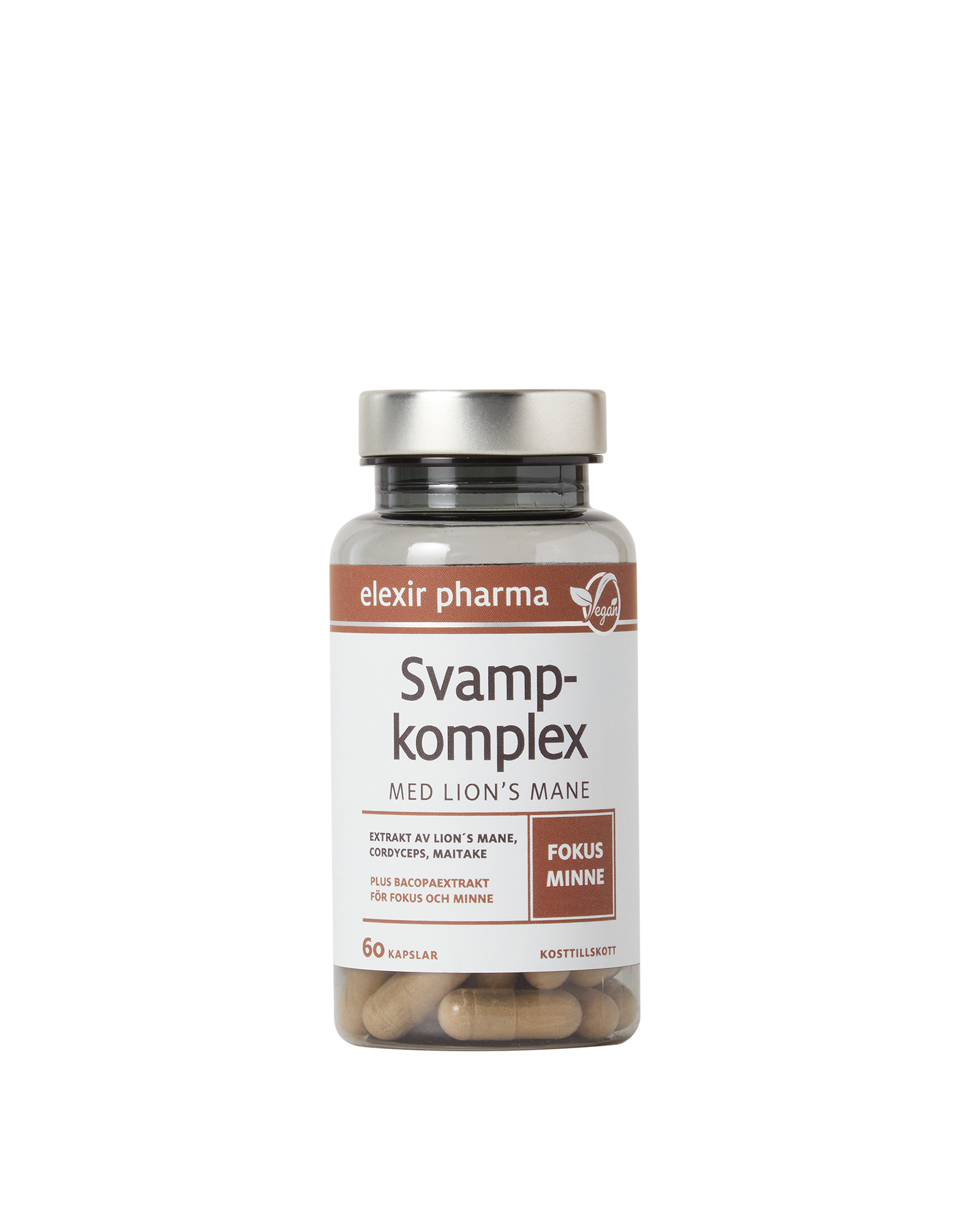 Elexir Svampkomplex med Lion's mane är ett kosttillskott för fokus, minne och förbättrad koncentration. Produkten består av tre olika svampar tillsammans med växtextraktet Bacopa monnieri som hjälper till att stödja den kognitiva funktionen, inlärning och minne samt hjälper till att förbättra koncentrationen.