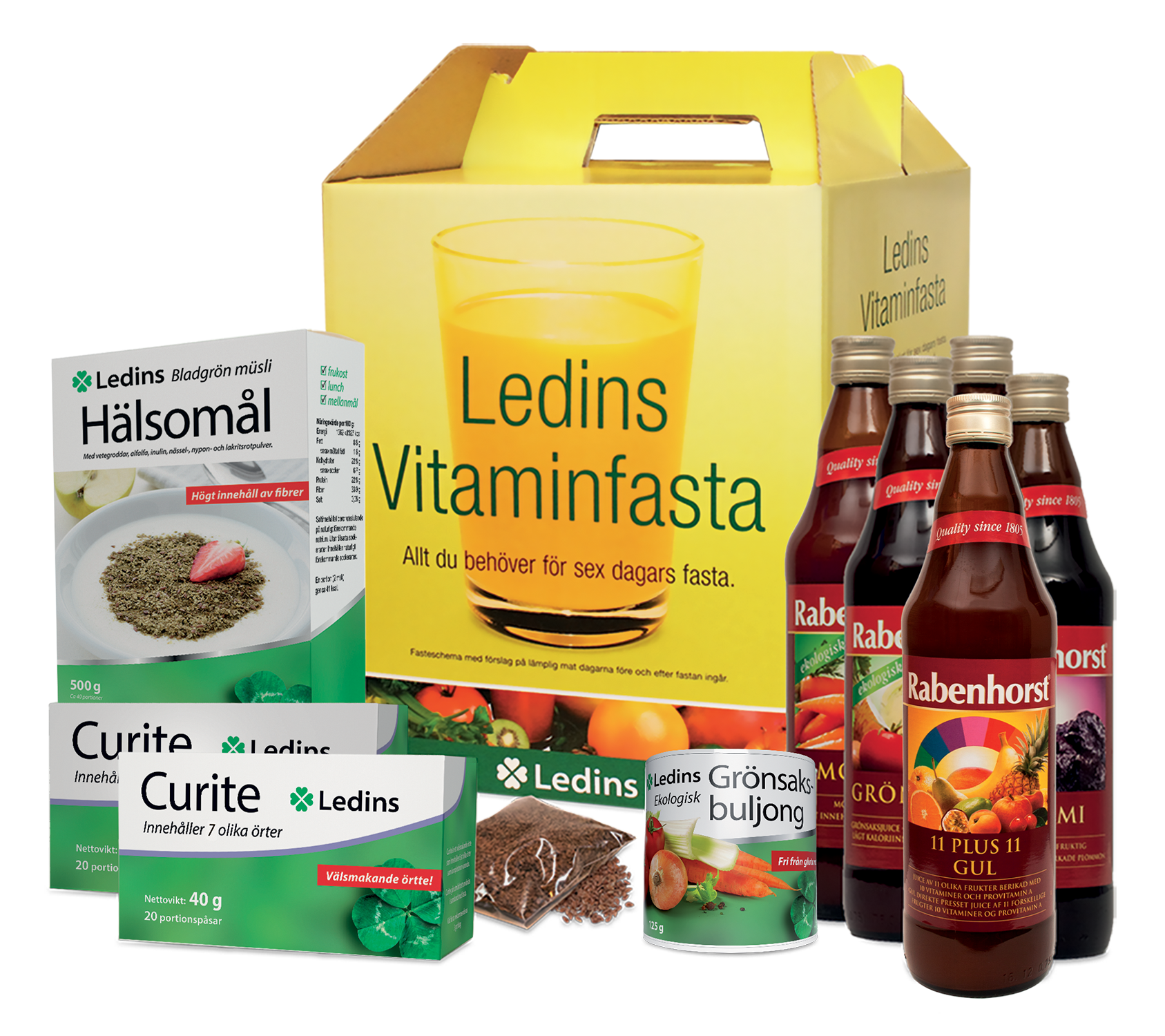Ledins Vitaminfasta är ett fastepaket med mycket hög kvalitet där produkterna är särskilt utvalda för att passa vid fasta. Paketet innehåller vitamin- och mineralrika juicer utan tillsatser, buljong med väl balanserat fett- och saltinnehåll, te särskilt framtaget för fasta, vitaminrik müsli och linfrö. Dessutom ingår ett noga utarbetat fasteschema för totalt 10 dagar som hjälper dig att nå ett lyckat resultat.