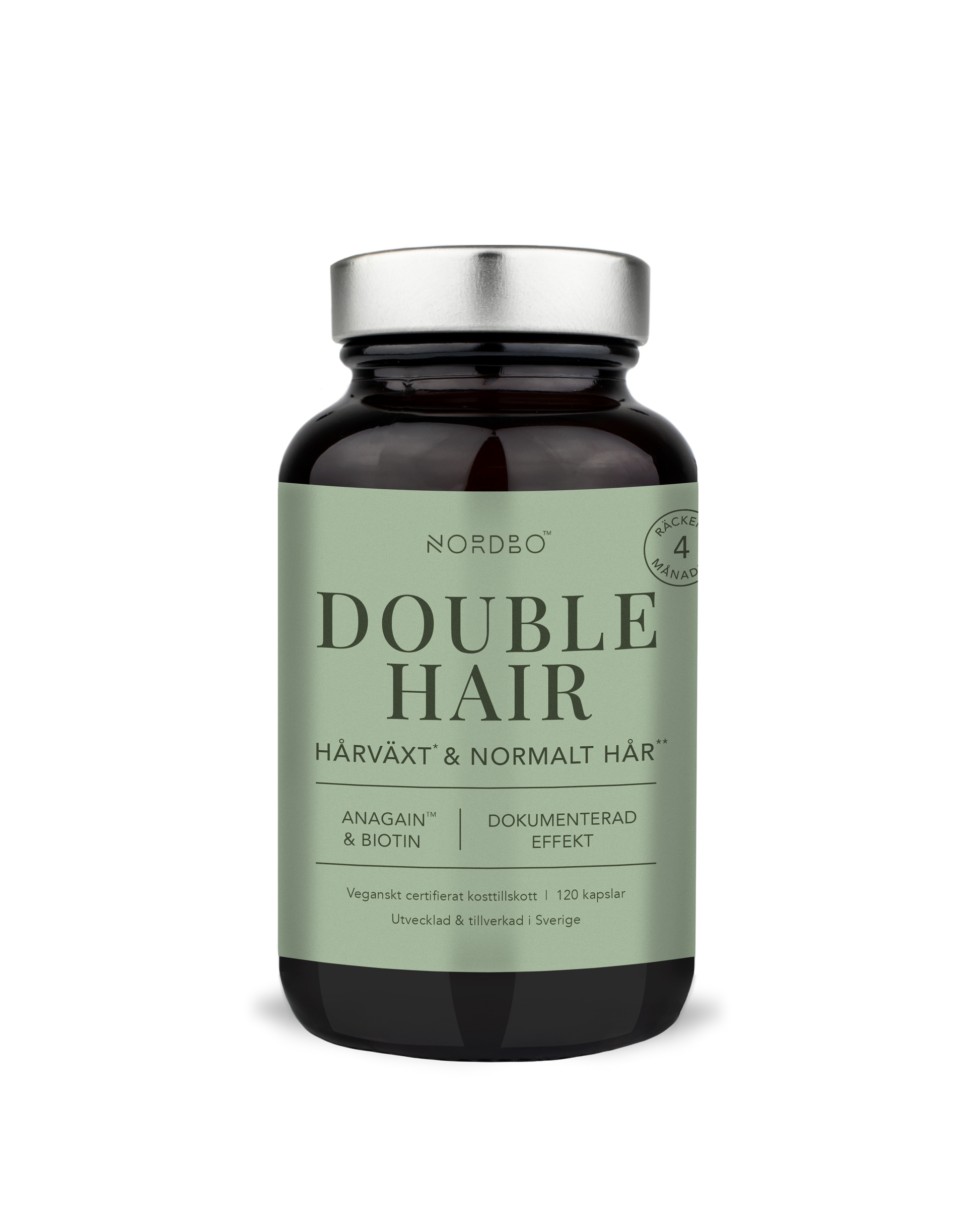 NORDBO Double Hair är framtagen för hårets tjocklek och kvalitet. Med en kombination av det ekologiska ärtskottsextraktet AnaGain™ och högdoserad biotin. AnaGain™ har testats i en studie som visade 37% minskat håravfall efter 8 veckor och har även vunnit Advanced Ingredient Award på Beyond Beauty i Paris. Endast 1 kapsel om dagen. 120 kapslar räcker hela 4 månader.