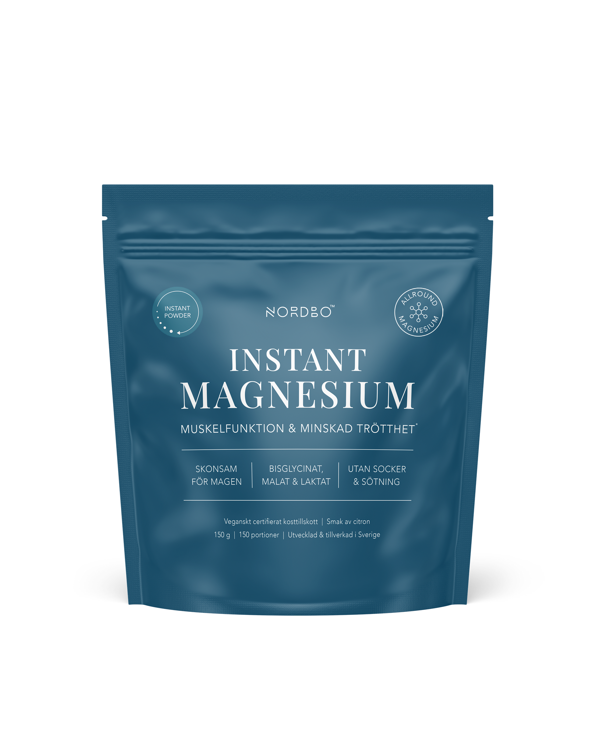 NORDBO Instant Magnesium är ett allround-magnesium i form av snabbverkande pulver. Pulvret består av tre magnesiumformer: magnesiumbisglycinat (83%), magnesiummalat och magnesiumlaktat. Samtliga har hög biotillgänglighet och är skonsamma för magen.