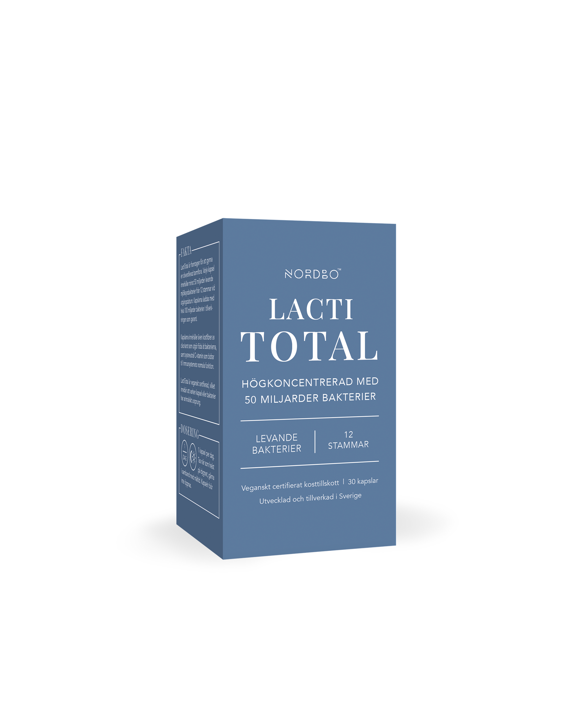 NORDBO LactiTotal är ett högdoserat bakterietillskott med 50 miljarder mjölksyrabakterier fördelat på 12 välstuderade stammar. LactiTotal innehåller både Lactobacillus- och Bifidobacterium-stammar. Kapslarna innehåller även inulin och syraneutral C-vitamin som bidrar till immunsystemets normala funktion. DRCaps®-kapseln skyddar bakterierna mot magsyra. Endast 1 kapsel om dagen.