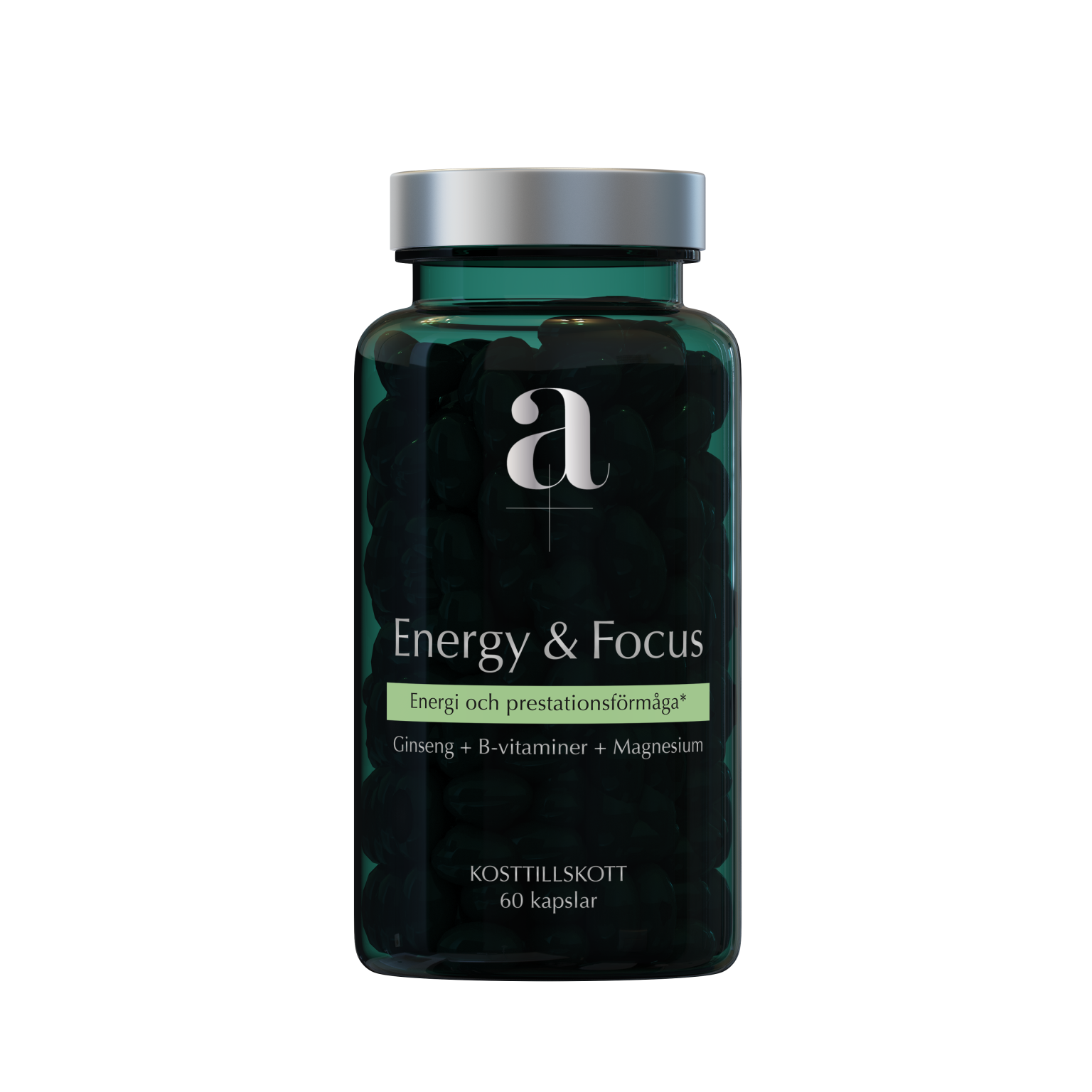 A+ Energy & Focus är speciellt utvecklad för att ge dig extra energi och fokus i vardagen. Produkten innehåller en sammansättning av viktiga och, för energimetabolismen stödjande, näringsämnen som B-vitaminer, C-vitamin och Magnesium.